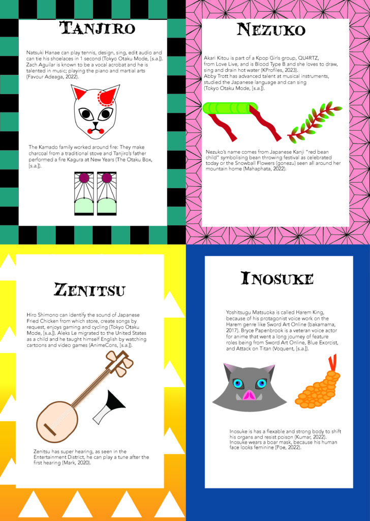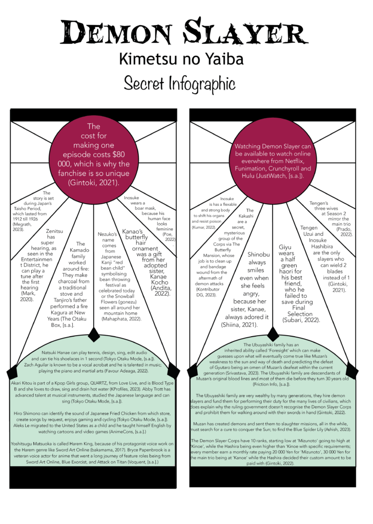 Project Objective: To make people in awe, surprised by the facts behind the chosen anime, whether it be the cost of the styled animation, the actors’ personalities/specialities, and the characters’ personal feelings/motivations about their own lives, back and forward.